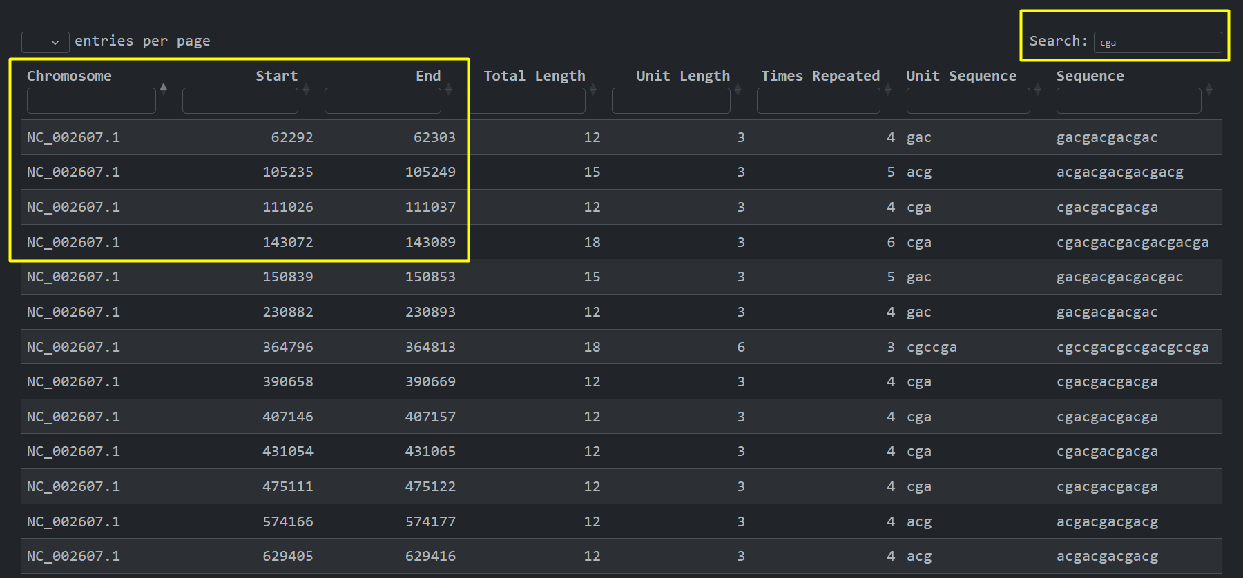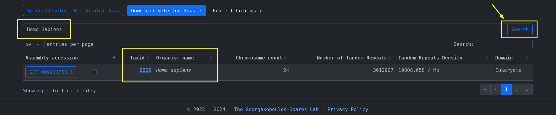We can then click on the accession id button of a specific row and navigate to the tandem repeats page of