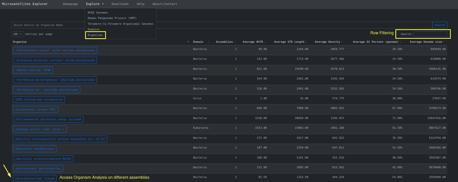 accessed through Explore > Organisms