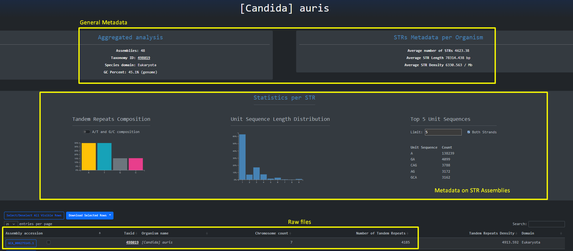 can gain a high level overview about STRs across assemblies and Inspect Filter and Download the raw files.