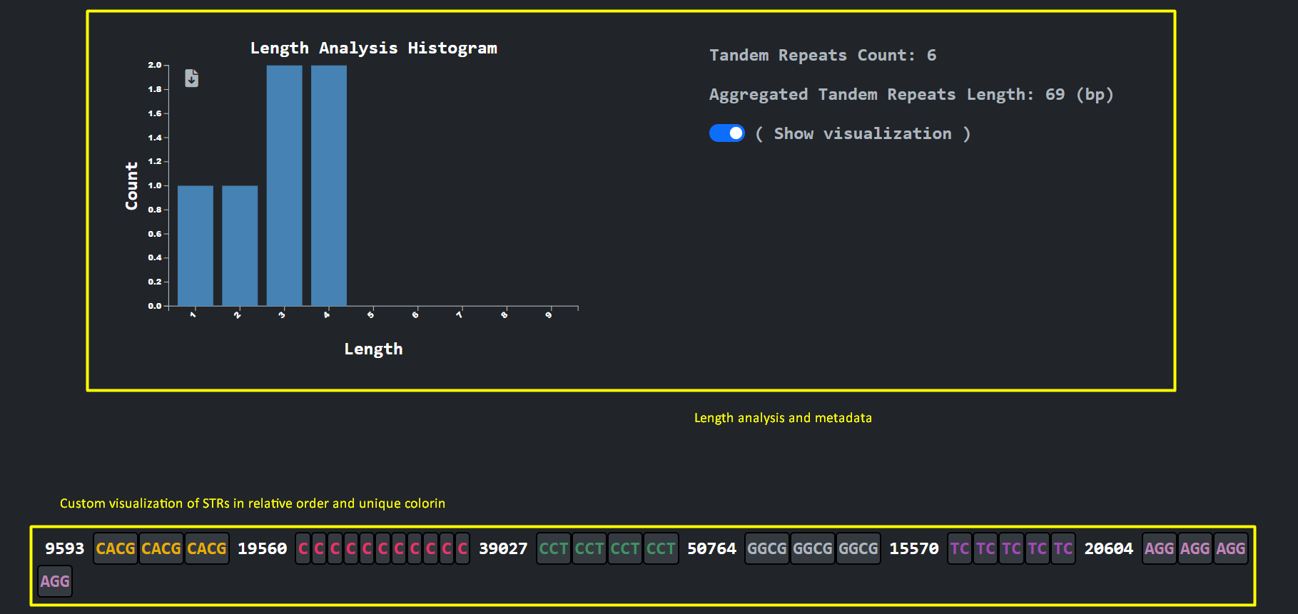 An analysis and visualization per chromosome that the user selects provides the user with the ability to inspect the different STR unit lengths along with an arbitrary presentation of the unit sequences using unique coloring and a magnitude number to denote the gap between consecutive STR sequences